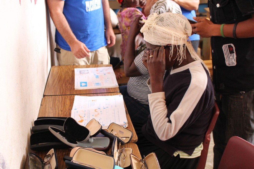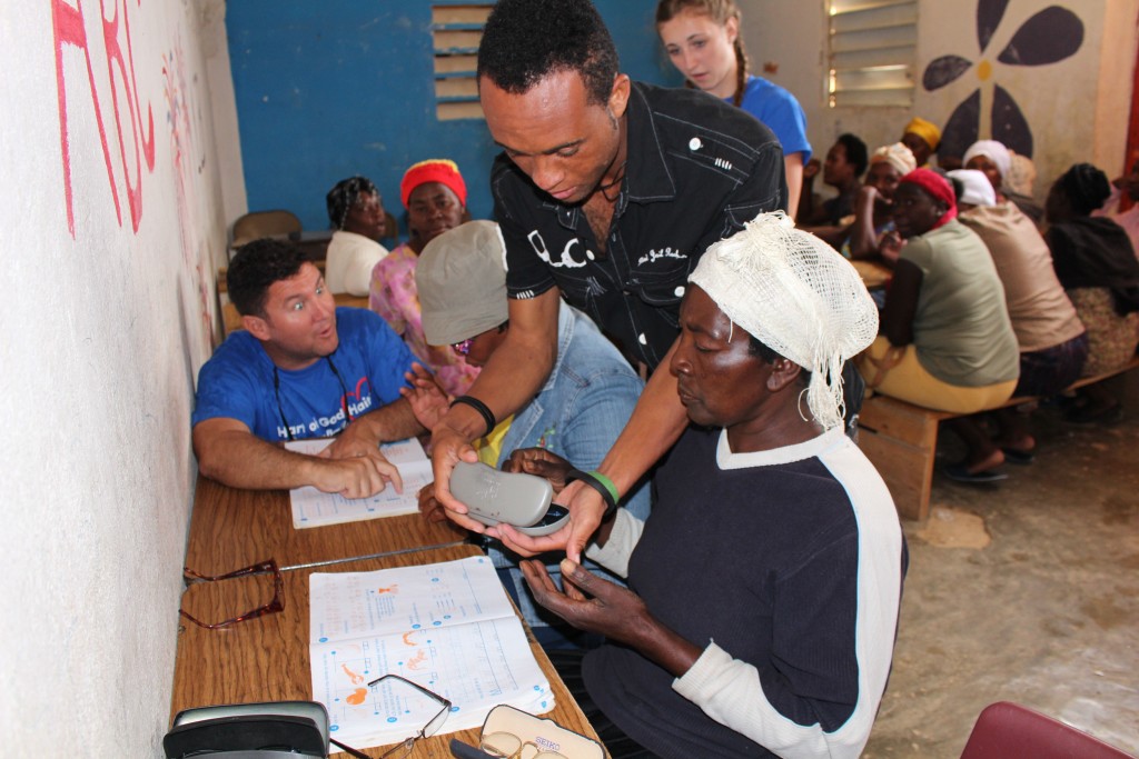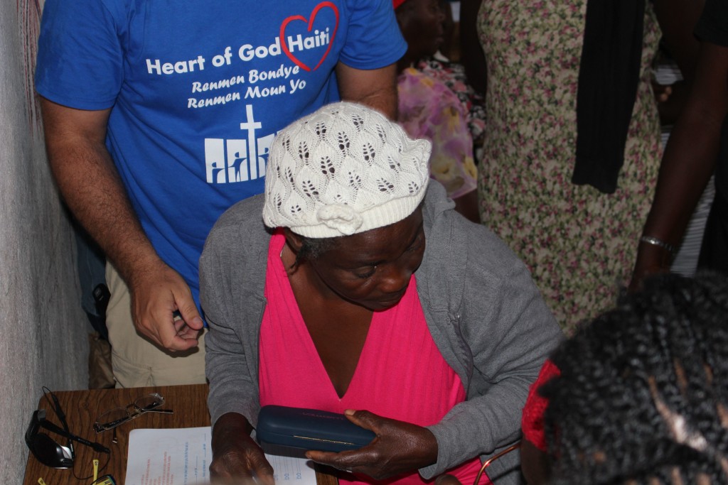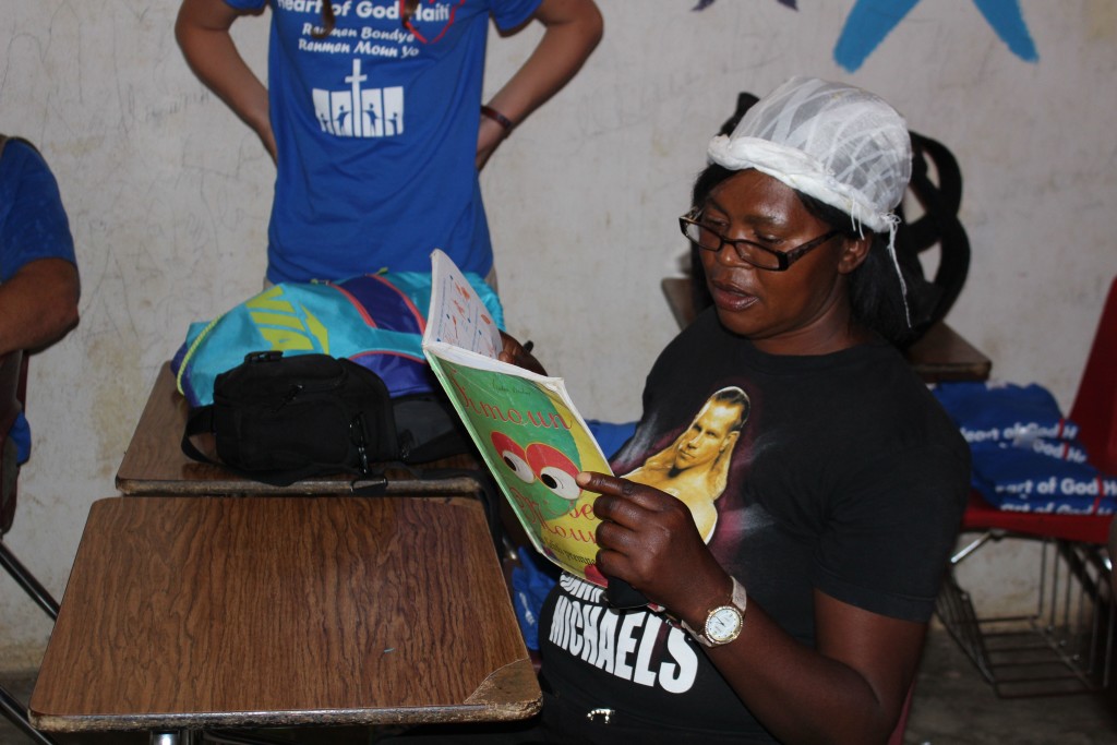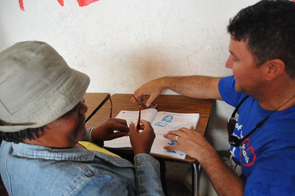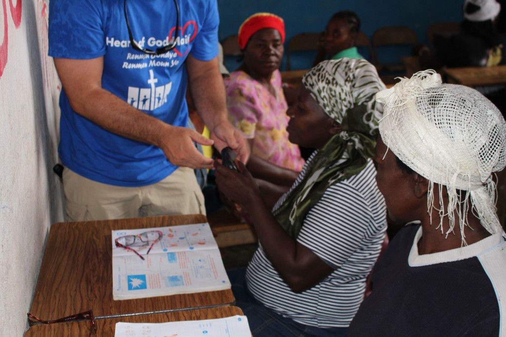 Heart of God Haiti‘s Adult Literacy Program created a challenge that caught us by surprise. Some of the folks learning to read and write and handle finances were plagued with poor eyesight which further complicated the task of learning as an adult. With generous donations from friends of Heart of God Haiti, we were able to provide reading glasses to several adults who struggled with their eyesight, making reading out of the textbooks much easier. We took some time to work with each adult, asking them to try on reading glasses while looking at a workbook. You could see their face light up once they were able to see clearly and make out the small letters they’d struggled to read only moments before.